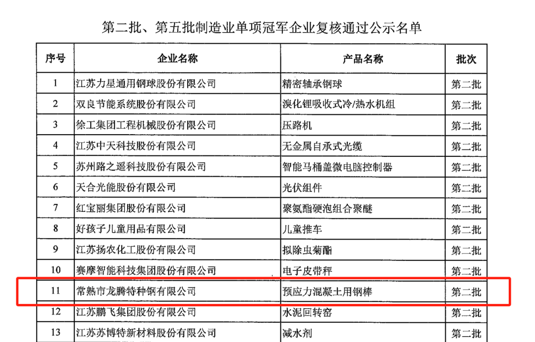近日,工信部公布通過復(fù)核的第二批、第五批制造業(yè)單項冠軍企業(yè)名單,常熟市龍騰特種鋼有限公司生產(chǎn)的預(yù)應(yīng)力混凝土用鋼棒和常熟市龍?zhí)啬湍デ蛴邢薰旧a(chǎn)的研磨機用研磨鋼球再次攜手登上“冠軍寶座”。