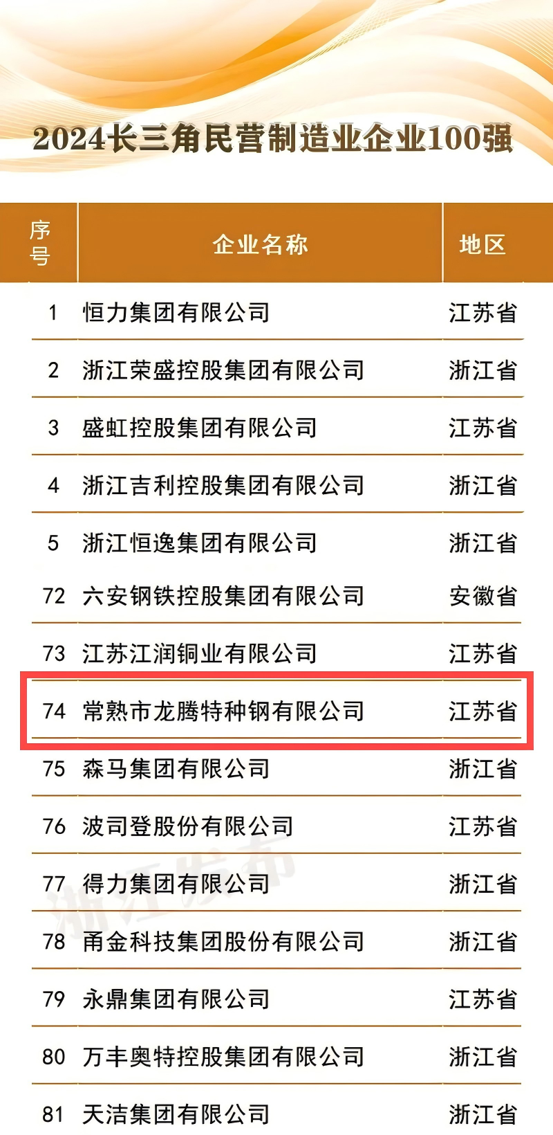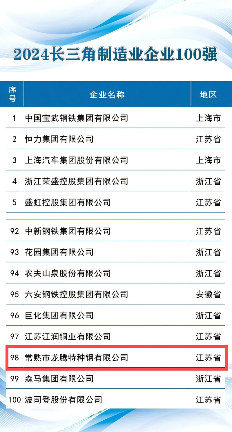 常熟市龍騰特種鋼有限公司位列“2024長(zhǎng)三角制造業(yè)企業(yè)100強(qiáng)”第98位;
