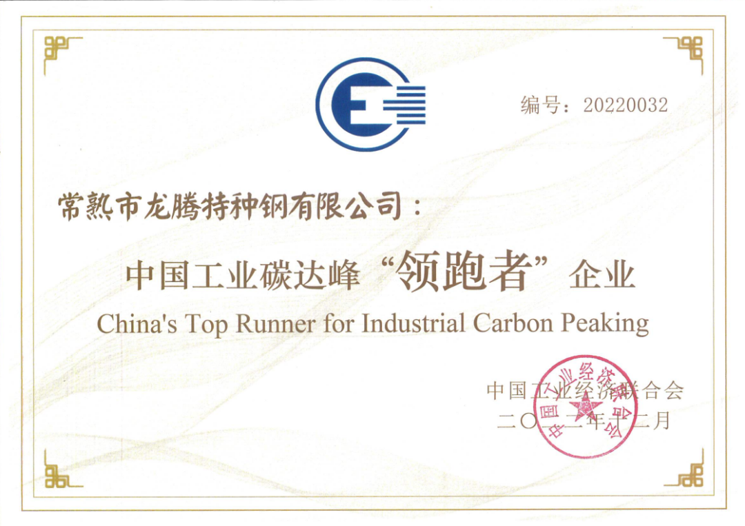 龍騰特鋼榮獲首屆“中國工業(yè)碳達(dá)峰‘領(lǐng)跑者’企業(yè)”榮譽稱號